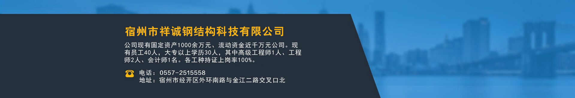 宿州市祥誠鋼結構科技有限公司位于宿州市經開區外環南路與金江二路交叉口北,公司是一家以建設產業化為目標,匯集大型鋼結構廠房、彩鋼活動房設計、制作、安裝施工一條龍服務的知名鋼結構公司。公司現有固定資產1000余萬元、流動資金近千萬元公司?,F有員工40人,大專以上學歷30人,其中高級工程師1人、工程師2人、會計師1名。各工種持證上崗率100%。高效化的年青團隊為公司帶來了蓬勃發展的動力,全體員工以務實的態度,拼搏的精神,創造著企業的每一天。      公司組織結構嚴格按現代企業制度設計,管理機構設置合理,制度完善,各部門分工明確...